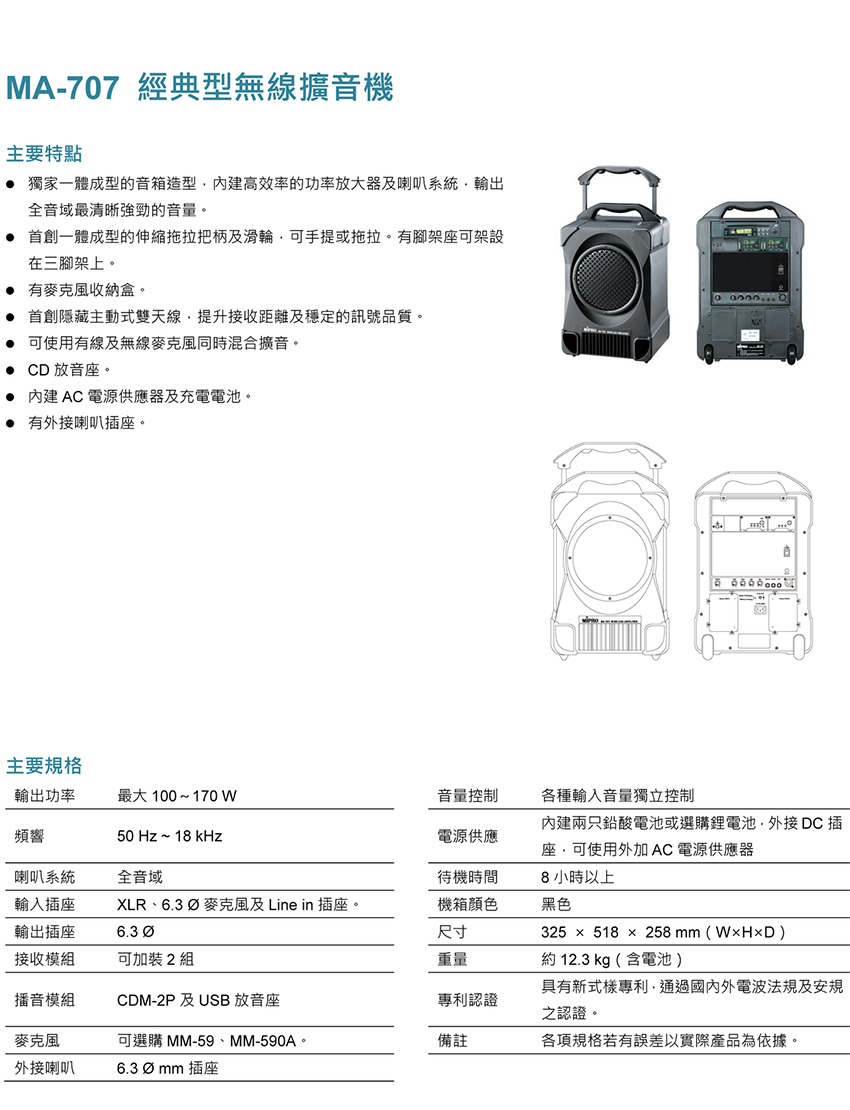 MIPRO MA-707 UHF 經典型攜帶式教學無線麥克風擴音機喇叭 CD座+USB+二支無線麥克風