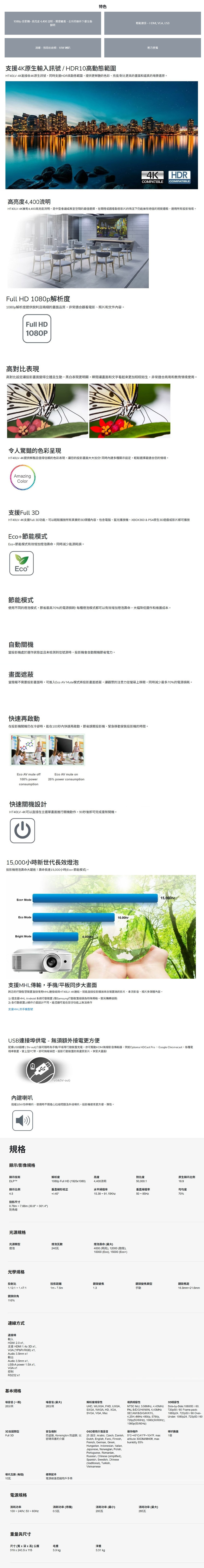 ▲1080p 投影機– 高亮度 4,400 流明、開燈觀看、在所有條件下都生動鮮明