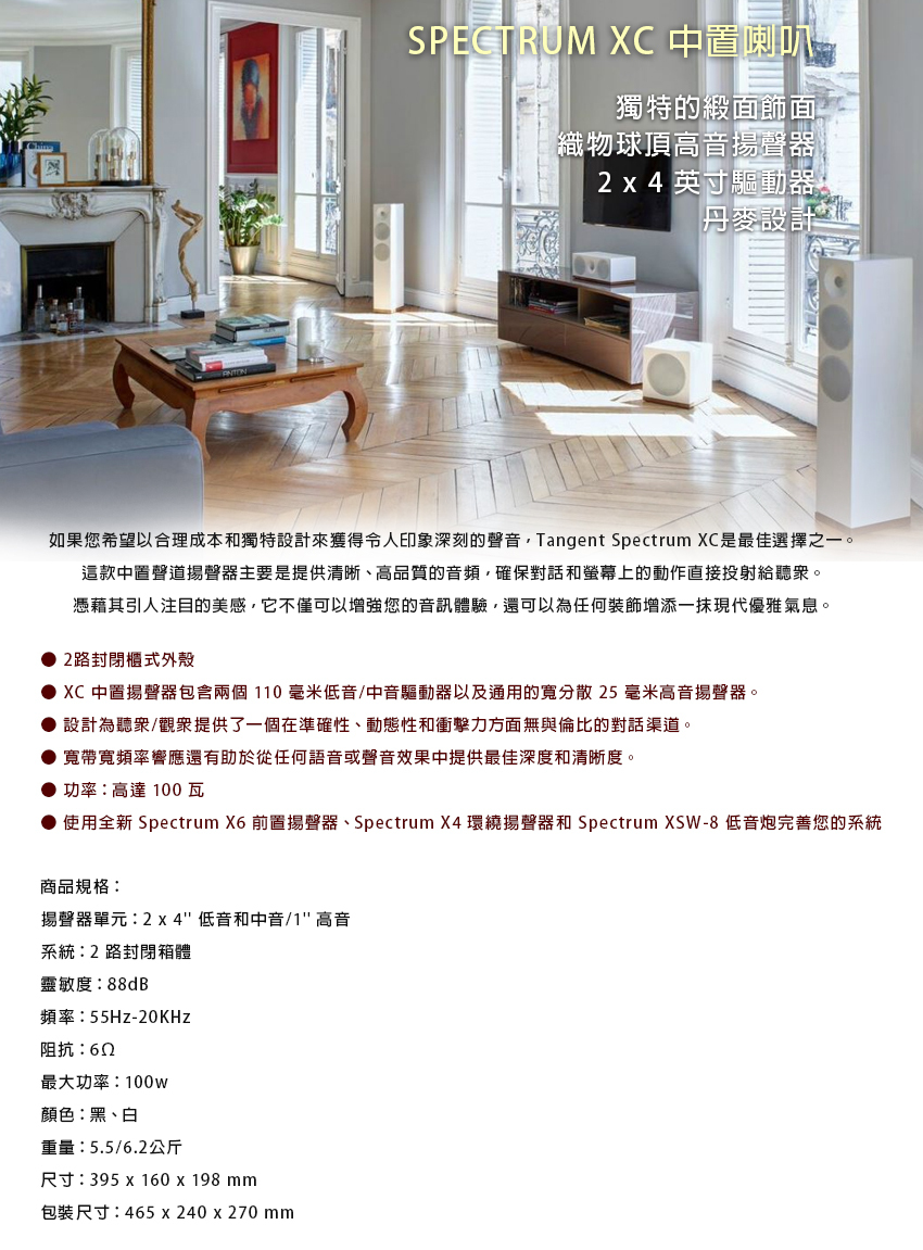 ● XC 中置揚聲器包含兩個 110 毫米低音/中音驅動器以及通用的寬分散 25 毫米高音揚聲器