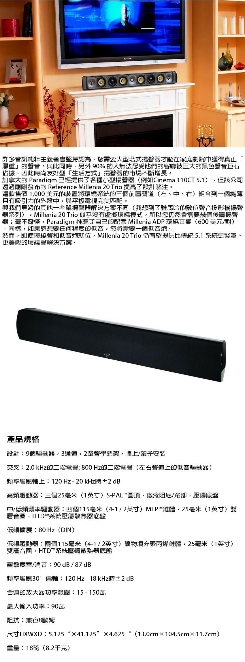 身為加拿大最具代表性品牌的Paradigm當然不會在這項產品上缺席,這款Millenia 20 Trip就是集合所有品牌旗艦技術於一身的Soundbar喇叭。