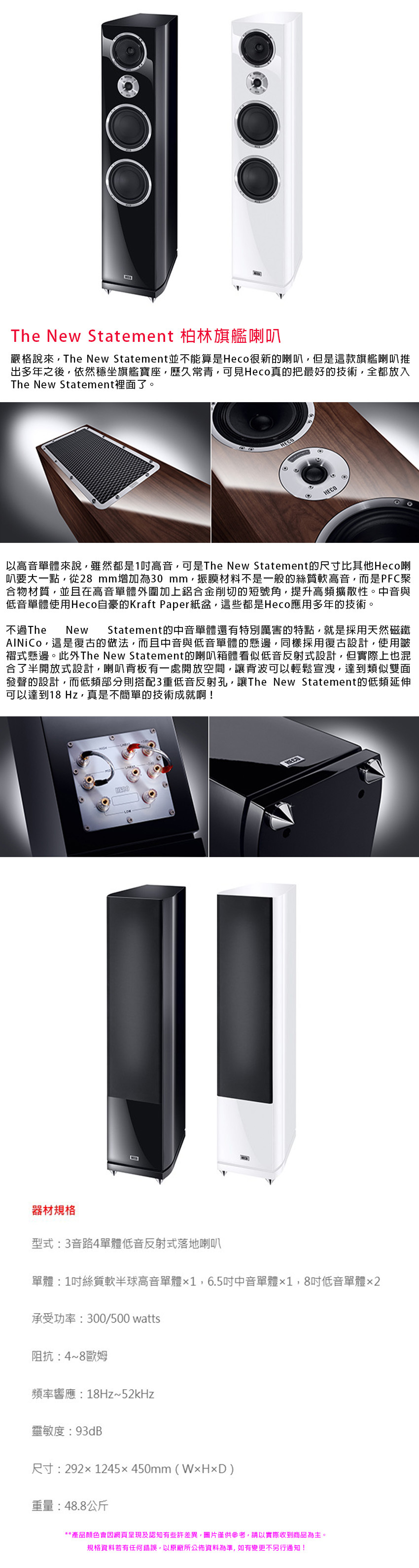 ● 鋁合金低音反射孔、三頻極接分頻接頭、鋁質防震角錐