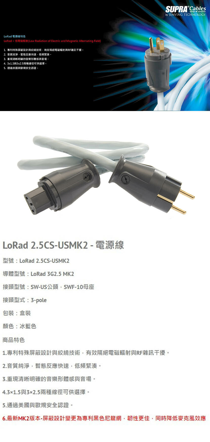 【澄名影音展場】瑞典 supra 線材LoRad 2.5CS-USMK2 電源線/冰藍色/公司貨