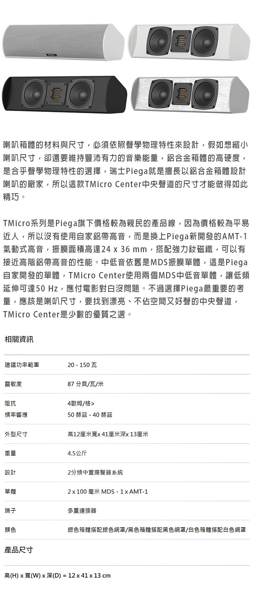 【澄名影音展場】瑞士 PIEGA TMicro Center 中置揚聲器 公司貨 黑/白色款